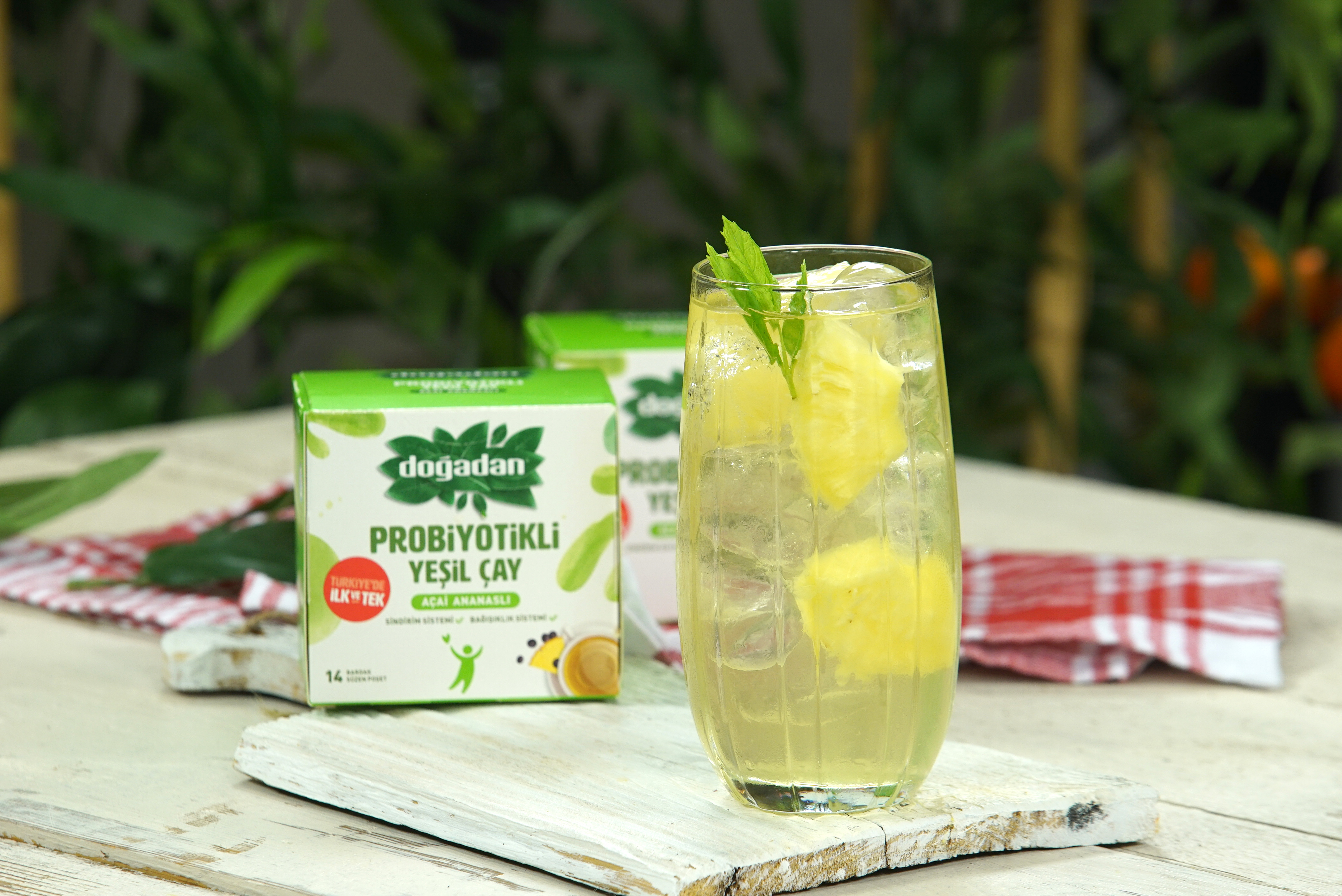 Infuse 4 bags of Doğadan Acai Pineapple Green Tea with Probiotics with 14 oz of boiled water and wait for 2 minutes at a temperature of approximately 80 C and infuse for 3 minutes. You can prepare your cold tea by adding 14 oz of cold water, 3 spoons of honey, 2 slices of pineapple, 8-10 cubes of ice.